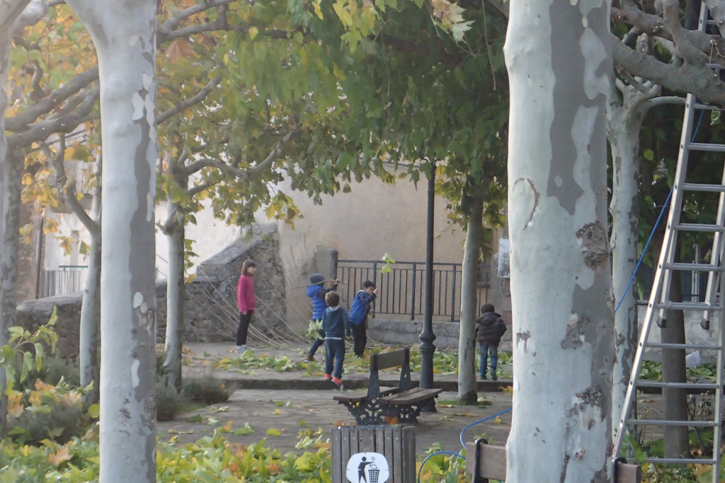職人が切り落としているそばで子供たちが葉のついた枝で遊んでいる。