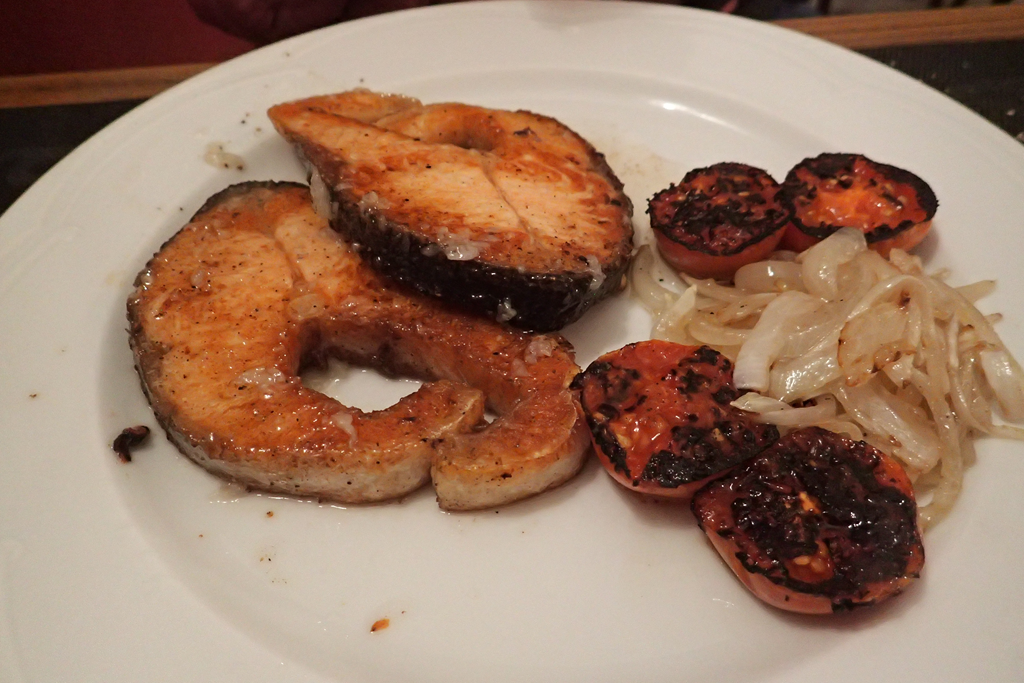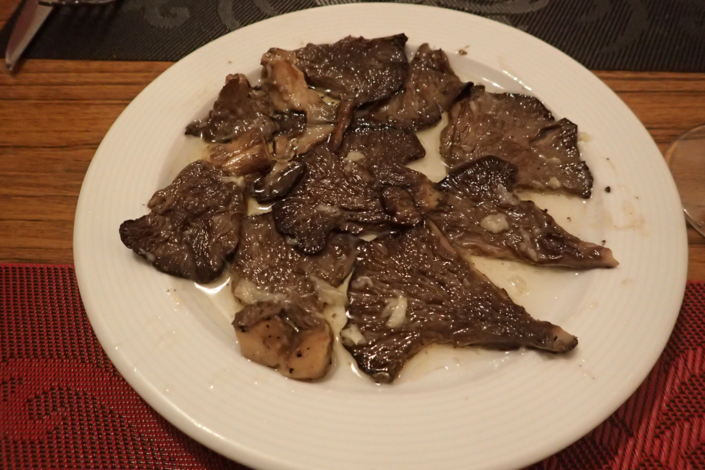 キノコのステーキ。ニンニクがよく効いていて美味しいが、塩のかけ過ぎ。