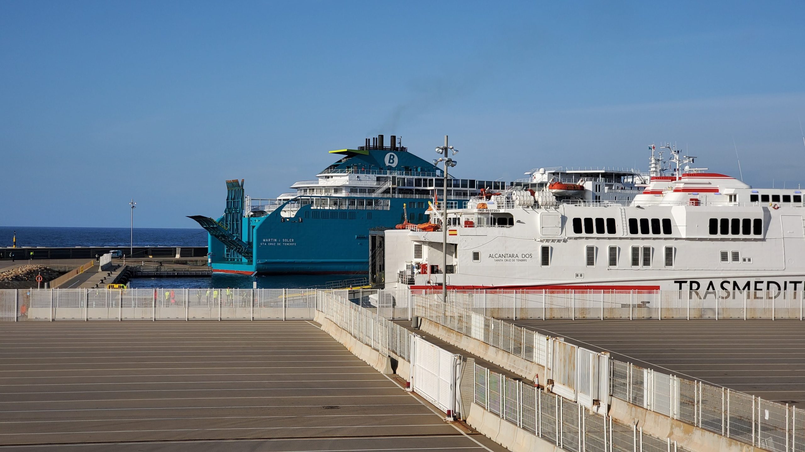 私たちが乗るのとは別のフェリーが入港し、その後に私たちの乗るのが入港。先の船が出港し、また別のが入港。私たちの乗るのはバルセローナから来たもの。ニュースによるとカタルーニャは大雨で洪水になっているところもあるようなので、荒天で遅れたのかもしれない。