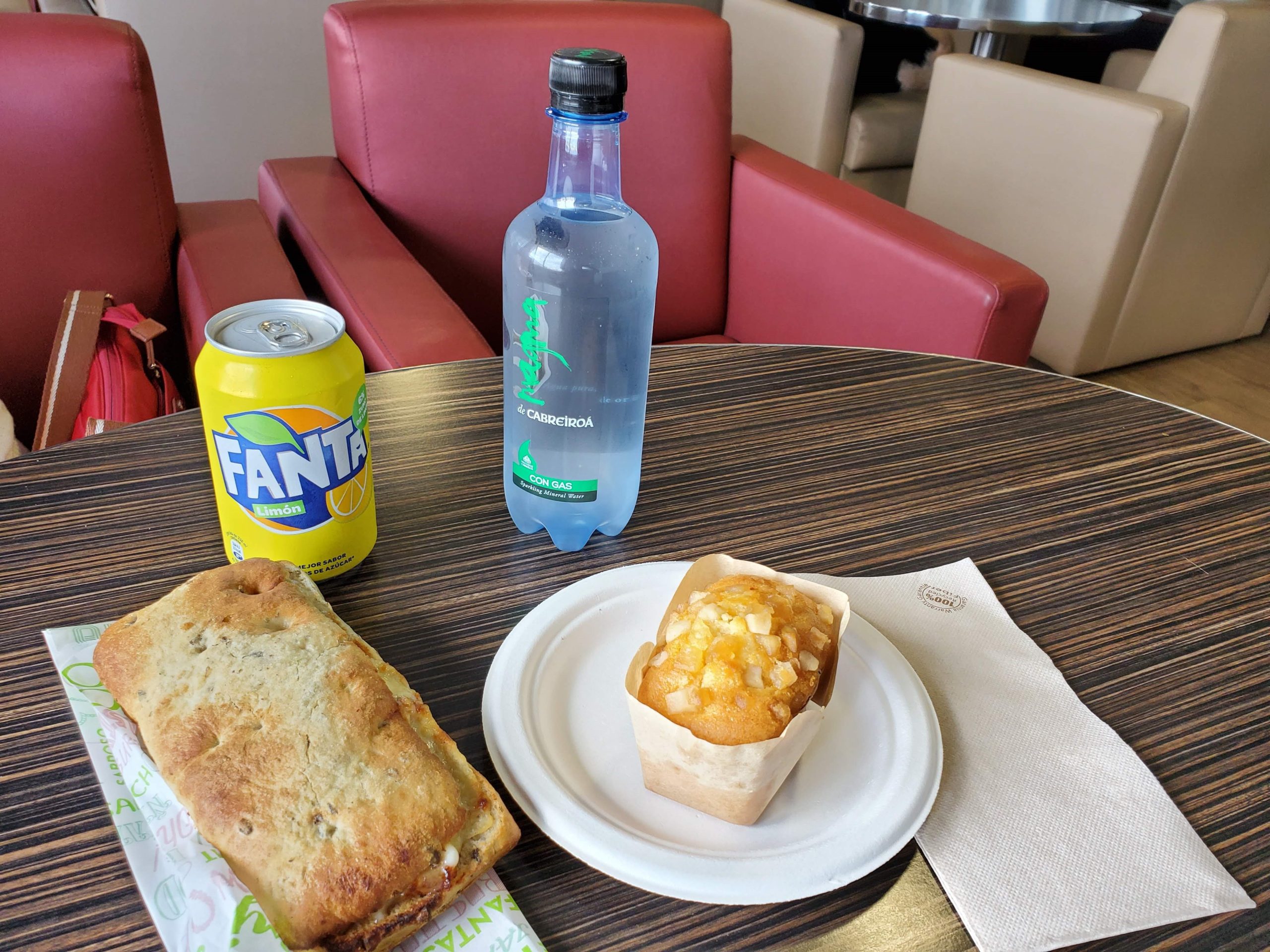 席に荷物や上着を置き、船内のBarでボカディージョとケーキ、Agua con gas、Limonadaを買い、サロンで食べる。まだ出港までに時間があったので、船内を歩き回る。甲板にも出てみるが、すっかり晴れて暖かい。