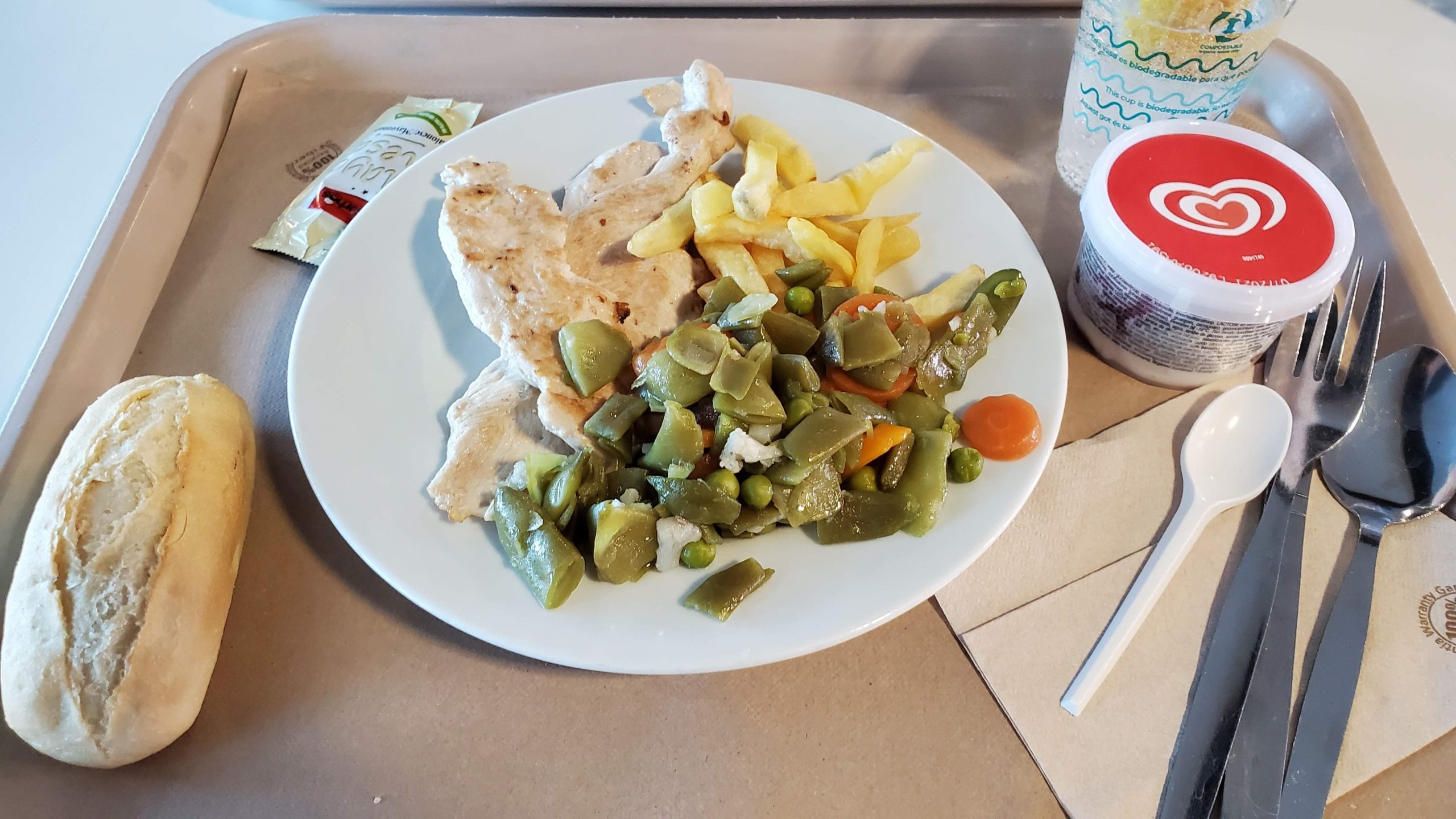 カフェテリア形式。サラダ、鶏肉のステーキのポテトフライと温野菜添え、サーモンのムニエルの温野菜とポテトフライ添え、パン、デザートのヨーグルトとアイスクリームを選ぶ。直径1.5mほどの鍋にパエージャがあって人気だったが、あれが美味しかったのかもしれない。私たちのは安食堂の味そのものだった。レストランでは最初はトラックの運転手らしき男たちばかりが食事をしていたが、やがて家族連れなども入ってきていた。食後はまた船内を歩き回る。