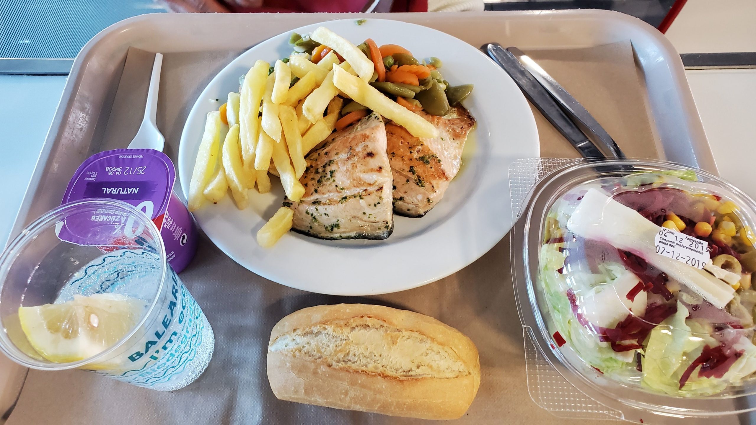 12時40分にようやく出港。客は先日のBarcelona~Maóよりも多い。出港して1時間ほど座席で眠る。1時半ごろに船内放送でレストランの営業開始が告げられる。このぶんだとAlcúdia着は15時ごろになりそうで、それから昼食では時間が無くなってしまうので、船内で食べることにする。![]()
