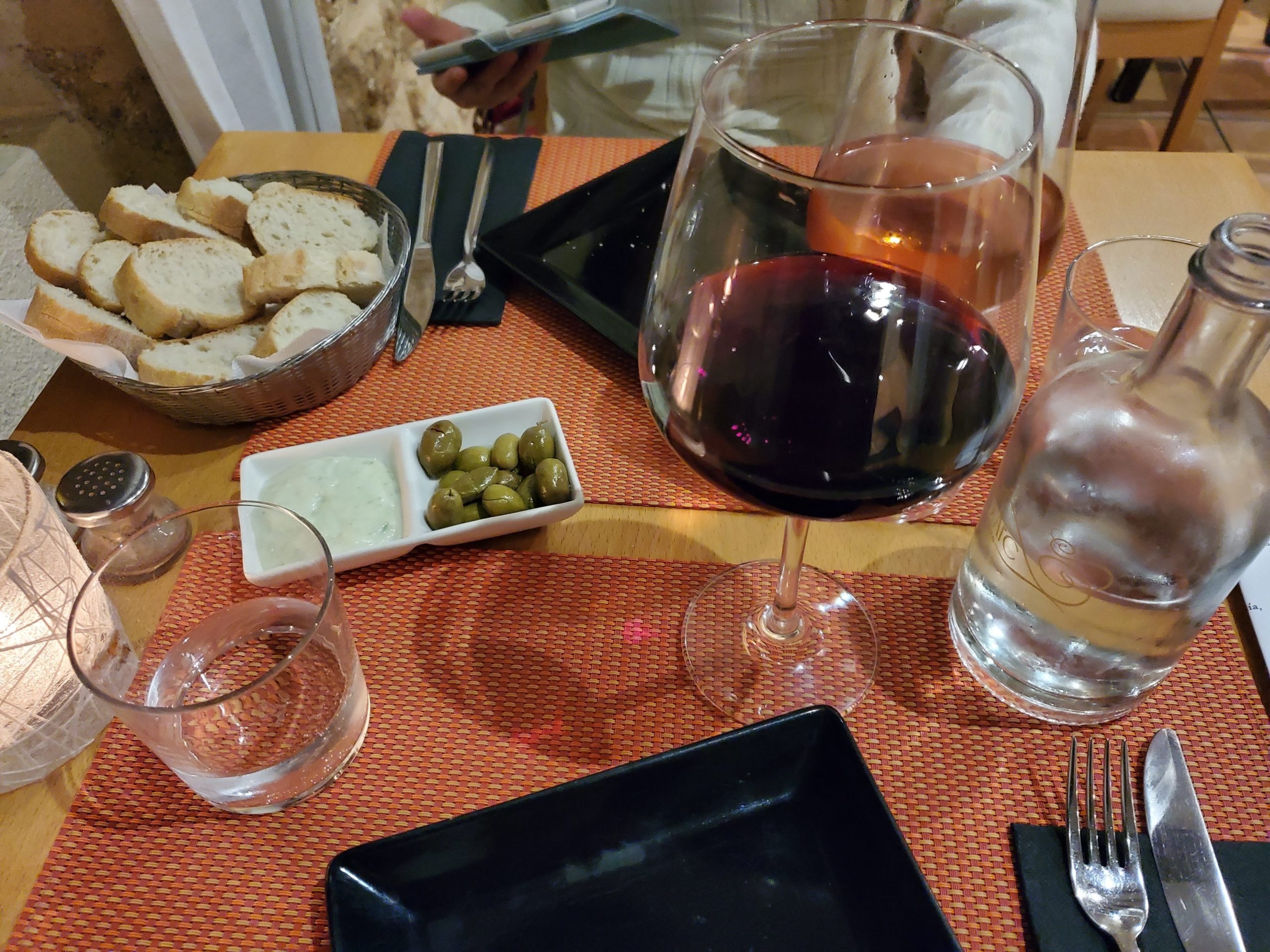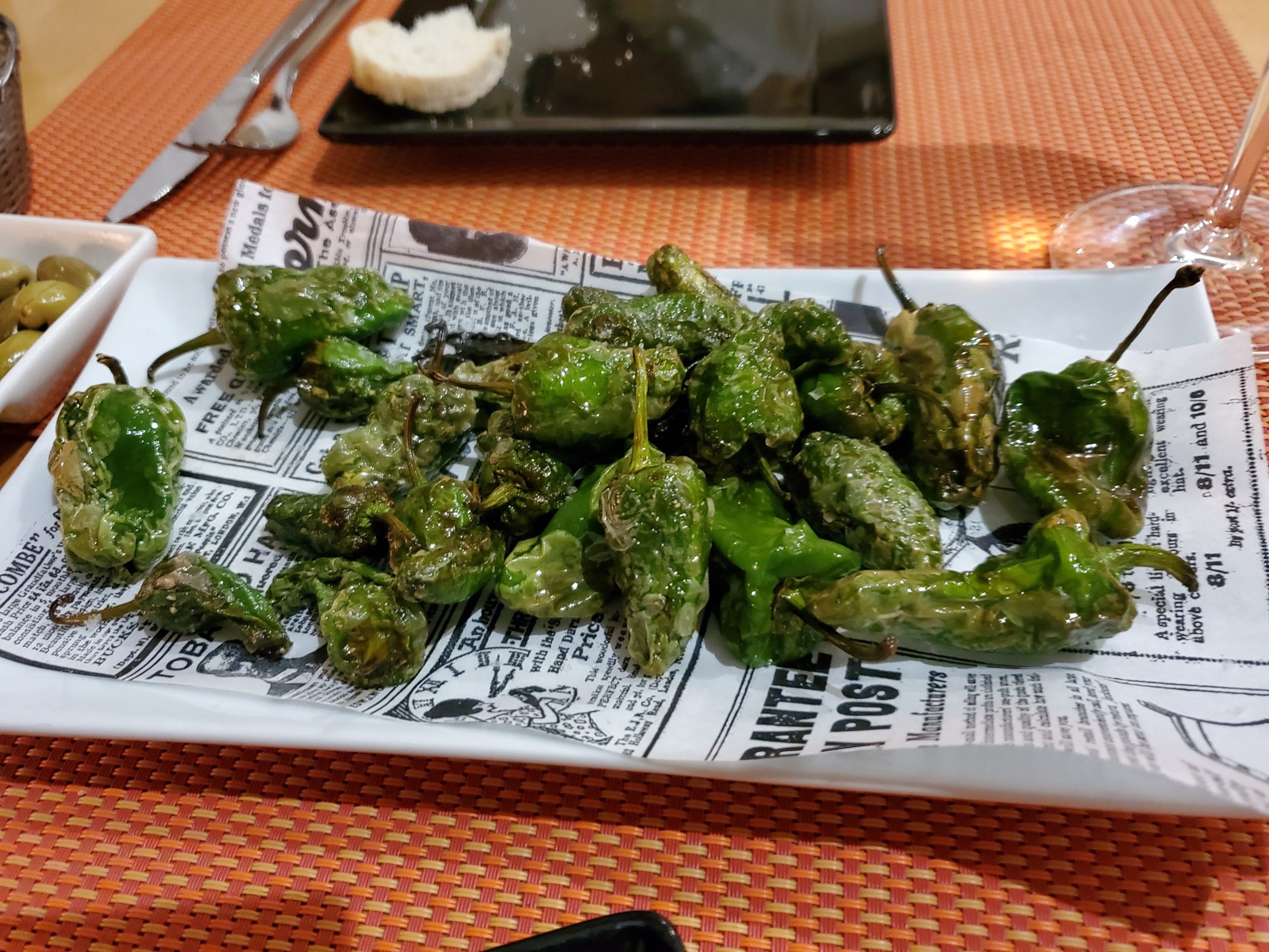 シシトウの揚げ物とPancitta、ロゼワインと赤ワインをグラスで、Agua con gas、パンにアリオリソースとオリーブを添えたもの。まずまずの味。結構流行っている店のようで少し早めの時間だったが客も良く入っていた。