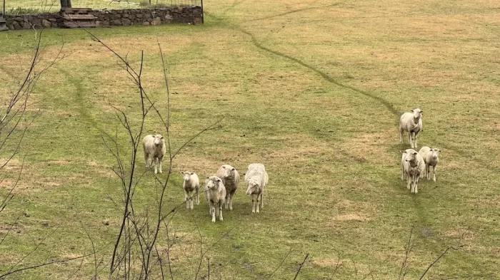周囲は今日も牧場。通りかかると羊たちはじっとこちらを見つめる。