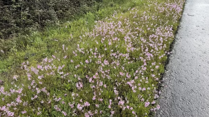 道は片側1車線のきれいに舗装されたもので、通行量は少ない。制限速度が70km/hや90なので車はスピードを上げて通過するが、、私たちの横を通る時には反対車線を通ってくれるので恐怖は感じない。