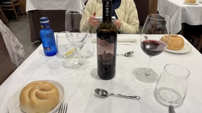 飲み物はAgua Con gasと赤ワインにしたが、最近では珍しくワインはボトルで出てきた。この後に見学を控えているのでグラス1杯しか飲めないのだが、せっかくなので配偶者も1杯。