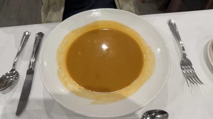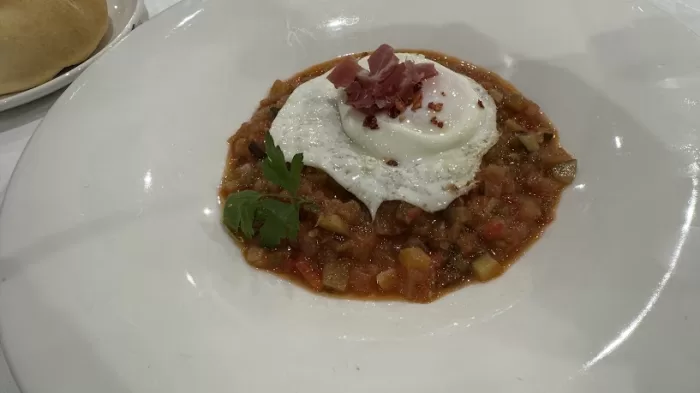 一皿目はSOPA DE PESCADO Y MARISCOとPISTO MANCHEGO CON HUEVO FRITO Y JAMÓN。