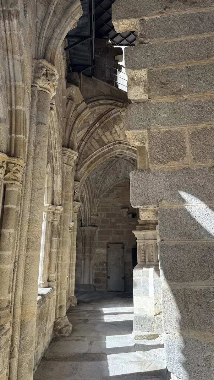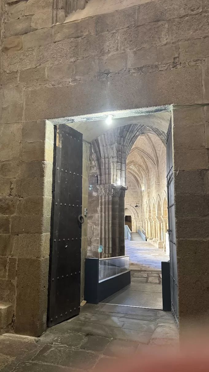 https://dosperegrinos.net/2025/03/17/sexta-peregrinacion-2716-3-2025-2//images/2025/05/image-309-700x393.webp/images/2025/05/image-309-150x150.webp銀の道 Camino de la PlataCamino,Camino de la Plata,Santiago,サンティアゴ,巡礼動画 Carcaboso〜Plasencia 7時起床。隣室はレストラン部門なので朝が静かなのは当然だが、ロビーの先、扉一枚隔てたところがBar部門なのに物音があまり響いてこない。Barは営業開始しているのか心配になったが、8時過ぎに行って扉を開けてみると、客がたくさん入っていた。 朝食はTostada、Croissant、Té con leche、Café con leche、Zumo de naranja。カウンターで注文してテーブルで待っていると、Barの主人が私の名前を呼ぶ。「チカ」で終わる名前なのでスペイン語ではchicaとなって「女の子」という意味。昨日の到着時にも笑って受け付けていたが、今朝も冗談にしていた。気の良いおじさんで、会計の時にクレデンシャルにスタンプをお願いすると、押すのに気を取られてしまって支払いを受け取るのを忘れてしまい、こちらが指摘すると横で見ていたおかみさんに怒られていた。 9時15分に出発。朝から細かい雨が降っている。予報では曇りなのだが。 今日の道筋は正規のCaminoではないので、持っているデータは使えないし、道に道標の黄色い矢印もない。Googleマップで目的地のPlasenciaの街を選択して道案内とする。 地方道(エストレマドゥーラ州道?)をひたすらに進めばいいだけなので迷う心配はない。Carcabosoの町を出て少し進んだところでCaminoの道標が1つだけあったが、それは反対方向を示していた。 道は片側1車線のきれいに舗装されたもので、通行量は少ない。制限速度が70km/hや90なので車はスピードを上げて通過するが、、私たちの横を通る時には反対車線を通ってくれるので恐怖は感じない。 周囲は今日も牧場。通りかかると羊たちはじっとこちらを見つめる。 水道橋のようなものが見え、遠目にはローマ時代のかと思ったが、近づくと鉄筋がはみ出していて現代のものと判明。 歩きながら息子に連絡。LINE通話を使ったが、国内でと全く変わりなく話せた。久しぶりに孫たちの元気な声も聞こえた。 高速道路を越えて大きなロータリーをいくつか通過し、Plasenciaに到着。雨は霧雨が降ったり止んだり、途中からは陽も差したりで暑くなり、道端でダウンを脱いだほど。 街の入り口のロータリーの中心には、ロードローダーが展示してある。2017年との表示があるので、そんなに古いものではない。市街地に入って再び雨が降り始めるが、もうすぐなので傘は出さない。 旧市街を取り囲む城壁の出入口の門が進路の正面に見えたので、そこから入るものと思ったが、地図は違う方向を示し、がっかり。 外周道路を少し歩いてホテルに到着。 13時に到着し、すぐにチェックイン。レセプションで地図をもらい、見学地に印をつけてもらう。この街のシンボルである新旧カテドラルは今日は16時までとのこと。急がなければ。レストランも紹介してもらう。 部屋で荷物を簡単に整理し、早速外出。先ずPl. Mayorに行き、昼食。ホテルで勧められた2軒のうち1軒はMenú del díaのメニューを出していたので、そちらに入る。Barの奥の階段を下って地下。予約で埋まったテーブルが多かったが、幸い空席もあった。 飲み物はAgua Con gasと赤ワインにしたが、最近では珍しくワインはボトルで出てきた。この後に見学を控えているのでグラス1杯しか飲めないのだが、せっかくなので配偶者も1杯。 一皿目はSOPA DE PESCADO Y MARISCOとPISTO MANCHEGO CON HUEVO FRITO Y JAMÓN。 二皿目はSECRETO IBÉRICO A LA PARRILLAとCARRILLERAS ESTOFADAS AL VINO TINTO。 デザートはTARTA DE QUESO CON FRUTOS ROJOSとHELADOS VARIADOS。どれも美味しくサービスも良かった。 食後すぐに新旧カテドラルの見学に。15時過ぎになってしまい、入口で16時までで時間が少ないのでオーディオガイドを全部聴いていては間に合わないかもしれないとの注意。入ったのは新カテドラル。新と言っても15世紀ごろの建築。 すぐに回廊を経て旧に。回廊は気持ちが良いが、聖堂内は特別の感慨はない。 展示品の中でタイル製の聖画が印象に残った。 再び回廊を経て新に戻るが、両者の境界をなす石壁がこのカテドラルの特徴ではある。旧ができたが気に入らなかったので新を建てたとのことだが、掘建小屋を建て直すのとはわけが違う。巨費と長年月をかけて建てたものを建て直すとは、傲慢でしかないだろう。 見終えようとした最後の一角にVRの体験コーナーがあり、ゴーグルをつけて見てみる。プラセンシアの紹介映像で、空中からの場面もあり、前後左右上下に頭を向けるとあたかも空中を飛んでいるような感覚。少し酔うようでもあるが、なかなか面白かった。そこで閉館時刻。 あとはどこも入館できるところはなさそうなので、街中を散策。城壁に囲まれているので、その内部を巡って、城門をいくつか見て回る。どれも小さな城門。日曜日の午後で閑散として人通りもほとんどなく、たまに見かける観光客風の人々はいずれも手持ち無沙汰といった