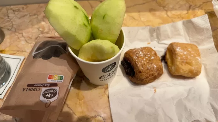 ホテルに戻り、ウエルカムサービスの菓子パンとりんごをもらって部屋に。