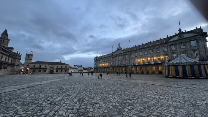 まだ雨は降りつついていて寒いが、13時少し前に出かける。人通りは少ないが、そんな中にポンチョをかぶったPeregrinoの姿が何人も見られる。私たちも、今回の前半だったら昨日の行程は2分割していただろうし、そうしていたら今日は雨で寒い中を歩かなければならなかった。昨日ちょっと無理をしてSantiagoまで歩いて良かった。