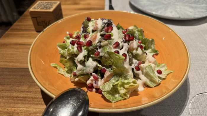 もう一皿はEnsalada。レタスにサーモン、ブルーチーズ、柘榴の入ったもので、美味しいがブルーチーズで結構食べ応えがある。他の客ならこの後にメインの肉か魚というところだろうが、私たちにはもう充分。