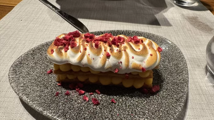 デザートはMilhojas(ミルフィーユ)とCacahuete(ナティージャとアイスクリーム)。デザートにも力を入れているようで、Camareraにデザートを注文するとにっこり笑って喜んでいた。あらためてデザートには3種類あると思わされた。Caminoの途中の安食堂では、例えばアイスクリームは市販のものをカップのまま出してくる。少しましな店ではアイスクリームを切り出して皿に乗せて出す。良い店ではデザートも作っている。