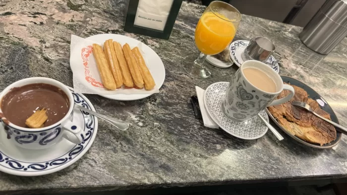 Chocolate、Churros、Té con leche、Zumo de naranja、Croissant。Chocolateは注文を受けてから練って(?)くれる。Churrosも注文を受けてから揚げている様子。Croissantは2枚におろしてから押し焼いたもの。Chocolate、Churrosは美味しかった。
