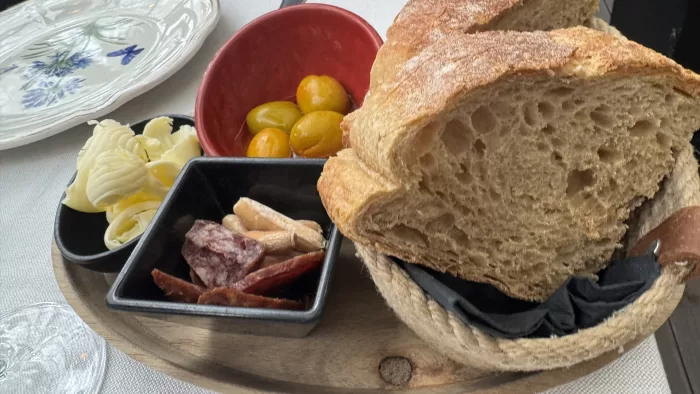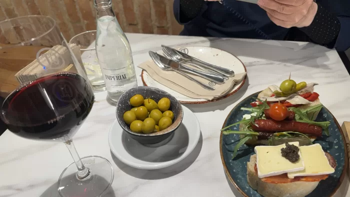 ホテルの近くの店で軽い夕食。Vino tintoとAgua con gas、そしてTres Pinchos。これは3種のピンチョスの盛り合わせ。美味しかったが、これまた小洒落て量は少なく値段は高め。オリーブがついてきた。