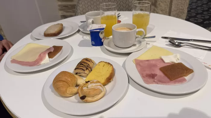 8時過ぎからホテルの食堂で朝食ビュッフェ。内容に特に変わったものはないが、ミニクロワッサンがクロワッサンの形をしたパンだったのでがっかり。またチョコパイ、ビスコッチョ、レーズンパイなども小さいので試してみたが、あまり美味しくない。ジュースは3種、コーヒーも数種類あって熱いのが飲めるので、飲み物に不満はない。あとはチーズ、ヨークハム、メンブリージョ、生ハムでごく普通。ホテルの朝食にしては10€と安いので文句は言えない。