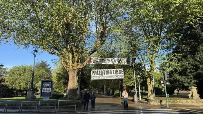 途中、アラメダ公園前を通る。入口に「パレスチナに自由を」の横断幕。