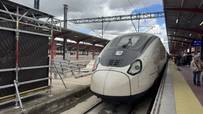駅に着いてみるとずいぶん混んでいる。やはりSemana Santaの影響なのだろうか。早めに着いたので待つことになるが、駅舎内のベンチは全て埋まっている。駅前のベンチが空いていたので座って待つが、寒くはないので助かる。10時36分発で、10時15分ごろから荷物検査。比較的順調に進み、ホームへ。例によってホームは分かるが乗車位置は不明。私たちは12号車だが、どちらが先頭かもわからない。幸い5分前に列車はやって来た上に私たちが待っていた位置の近くに12号車が停まったので戸惑うことはなかった。座席は2列+3列配置で、私たちは3列の窓側と真ん中。車内はほぼ満席。この混み具合だと駅に来て切符を買おうとした人の中には乗れなかった人もいるのではないか。