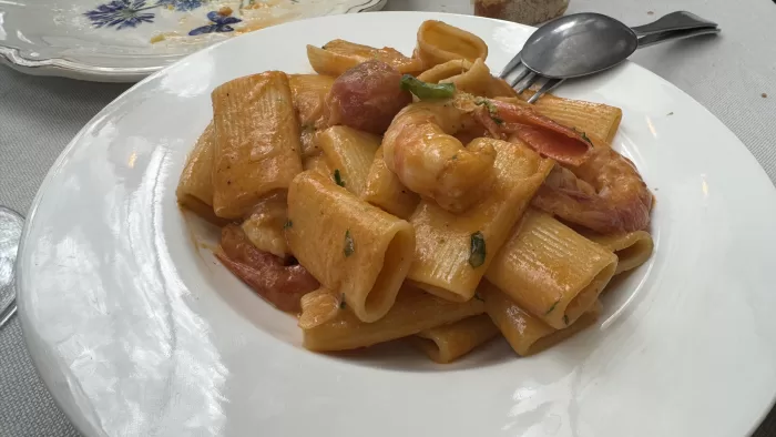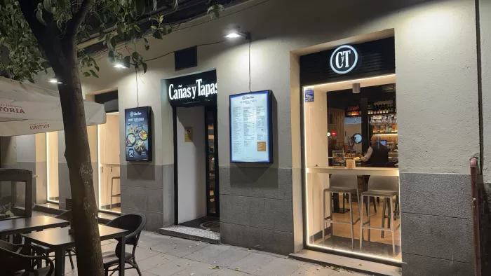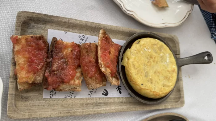 飲み物はVino tintoとAgua con gas。料理はTortilla de patata individualとRigatoni con gambones al ajillo。パンにサラミとオリーブがついてきた。どれも美味しかったが、小洒落ていて量は少な目、値段は高め。さすがにMadrid中心部だ。