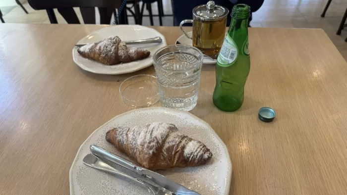 乗車券が入手できたので、近くのホテルのBarで休憩。Agua Con gas、Menta polea、クロワッサン。汗をたくさんかいたせいか、喉が渇く。