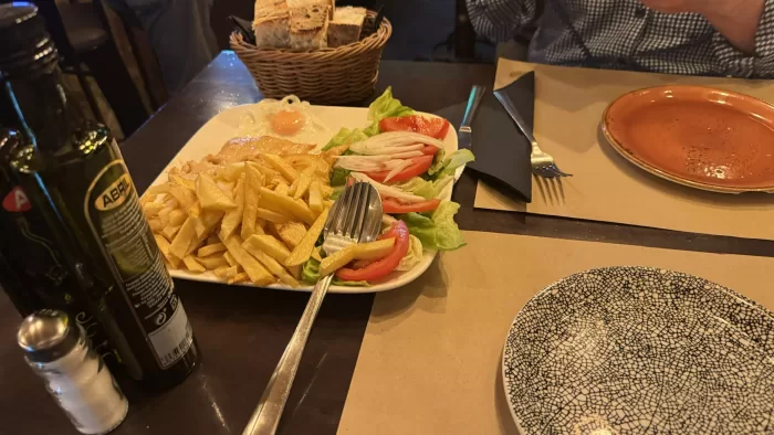 無難なところでPechugaにする。野菜サラダ、ポテトフライ、目玉焼きがついたもの。料理ができる直前にテーブル席が空くと、すぐに移動させてくれる。Pechugaは美味しいが、味を云々するような料理ではない。それよりも家族経営で母親と息子、娘たちでやっていて対応の気持ちの良い店だった。