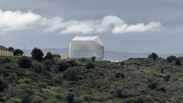 街を出て振り返ると異様な建物が遠くに見える。巨大なビニール袋をかけたようでもあり、温室のようでもある。後刻ネットで調べてみたらPalacio de Congresos de Plasencia、コンベンションセンターだった。