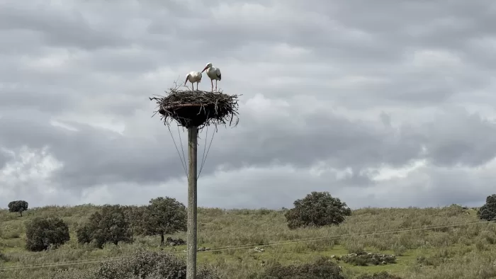 電信柱のてっぺんにコウノトリが巣を作り、つがいで卵を温めているらしい様子。