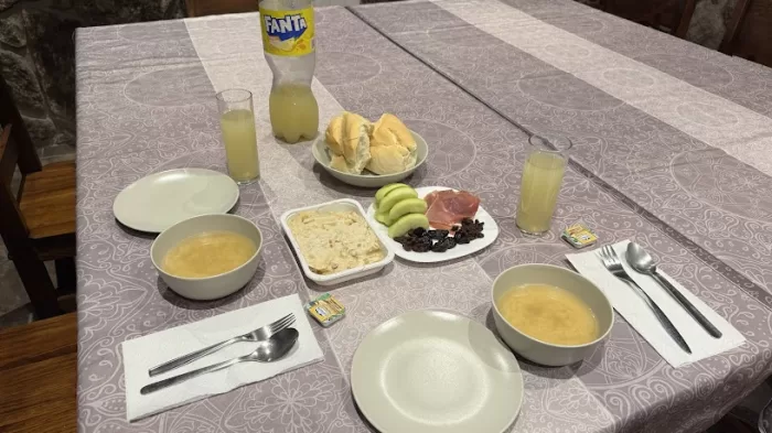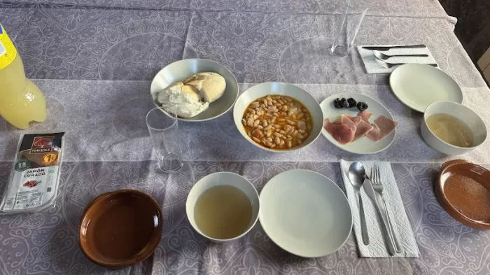 部屋に戻り、共用キッチンで用意して、共用食堂で食べる。食堂の一角はサロンになっていて、ストーブが焚かれている。窓の外にこの宿に入るらしいペレグリーノ夫婦らしき姿が見える。やがて宿の人がやって来て入室。