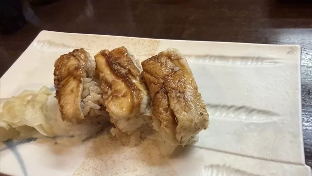 穴子鮨が名物とのことなのでインターネットで調べて近くの店を予約する。18時行ってみると混んでいて、予約したのが正解だった。カウンター席を選んで「千利休」という日本酒を飲む。あっさりして美味しい。