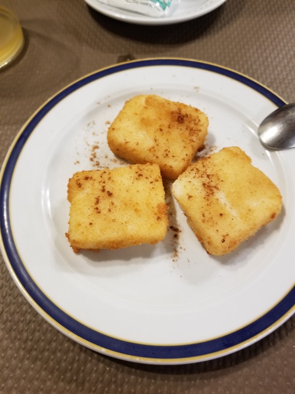 朝食は9時からということで、出発の準備をして朝食後すぐに出られるようにする。9時少し前にCafeteriaに行ってみると開いていて、すぐに注文を聞いてくれる。もちろんほかに客はいない。Café con leche, Té con leche, Zumo de naranja, Tostada。オレンジは絞ったもので美味しい。レセプションの女性が給仕をする。食後すぐにチェックアウト。9時40分には出発できた。宿の他の部屋では物音のするところもあるが、大部分はまだ起きていないよう。