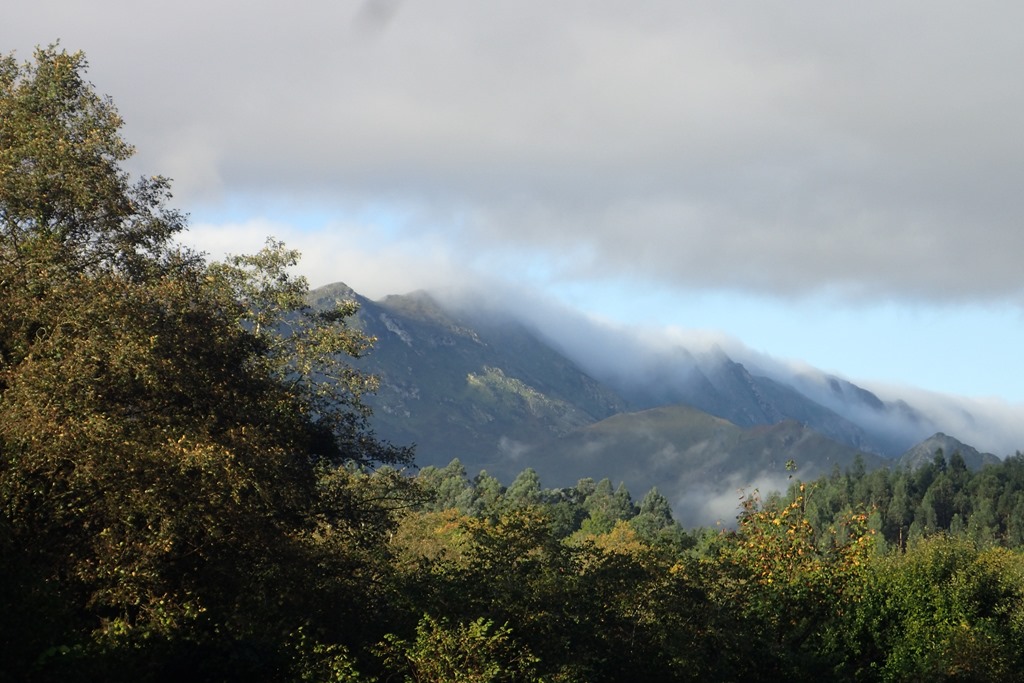 左にPicos de Europaに連なる高い山々が見えている。雨上がりの青空の下、山には雲のかかっているところもあるが、稜線がはっきりして、山が近く高く見える。