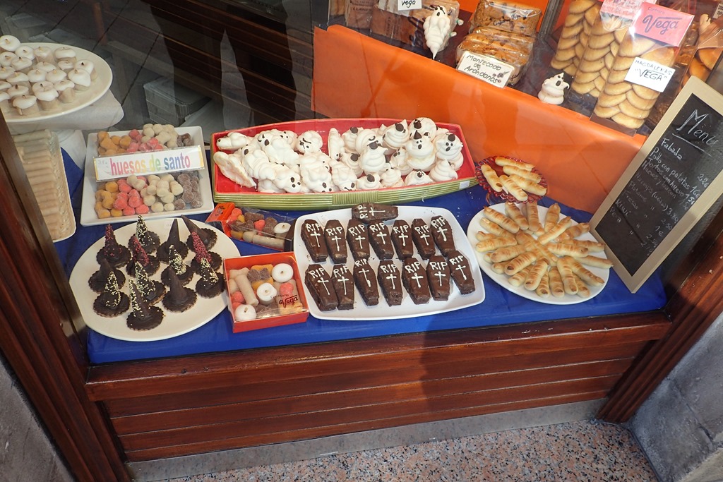 ケーキ屋のショーウィンドウには、指、棺桶、骨の形のなど、諸聖人の日のお菓子が並んでいる。できれば再訪したい。