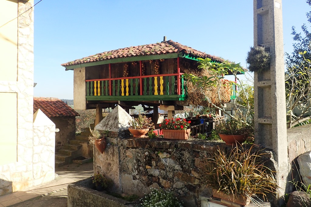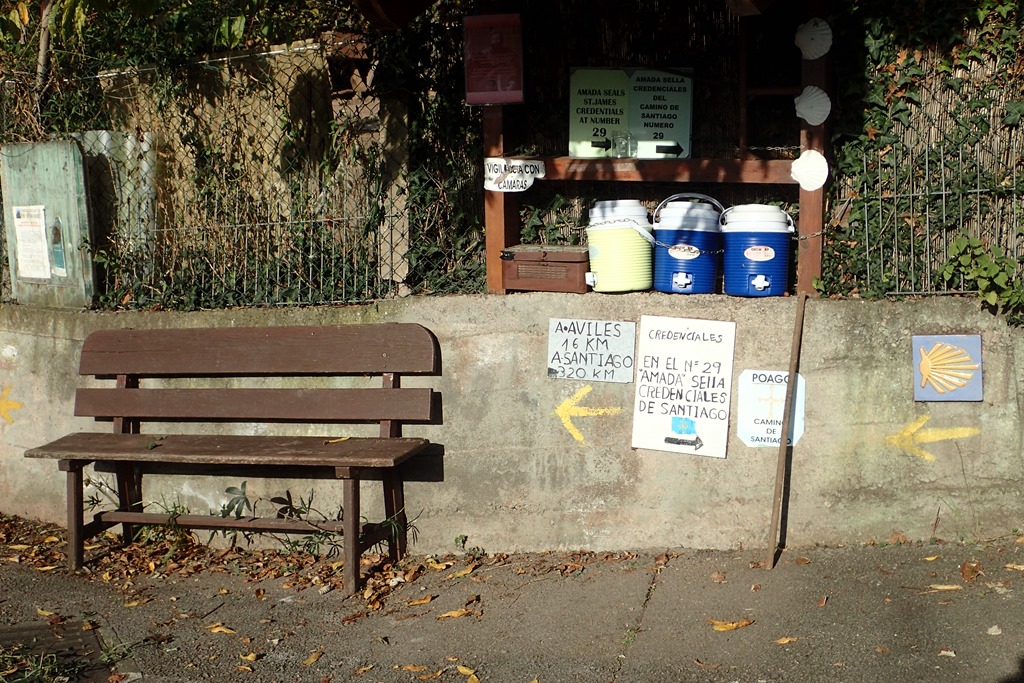 坂の途中の壁に水のサービスがあり、29番地にSello(スタンプ)があるとの貼り紙。すぐ上なので行ってみると、家のガレージの横の小部屋で中年男女のPeregrinoがおばあさんと話していて、そこでスタンプを押せる。3人は話し込んでいるので、お礼だけを言って私たちは歩きだす。貼り紙にはAvilesまで16㎞、Santiagoまで320㎞とある。Avilesまでのは正確なので、Santiagoまでのも信用できるのかもしれない。