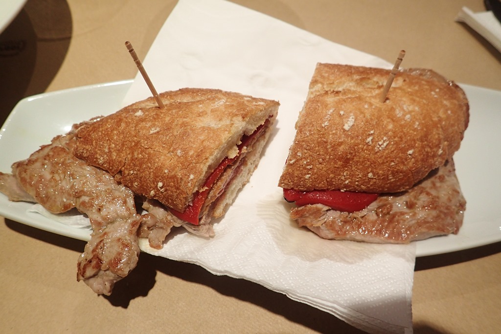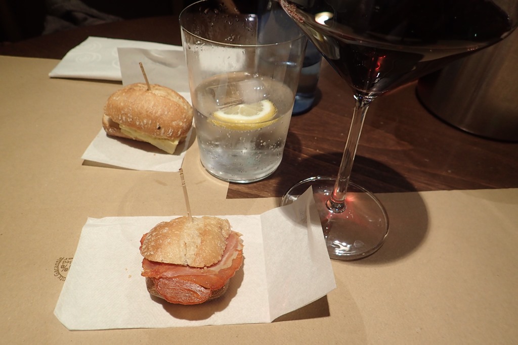 まず、店からのプレゼントと言ってちいさなBocadilloが配られる。TortillaとLomo。赤ワイン一杯とAgua con gas。Ensalada TropicalとTerneraのピンチョ。