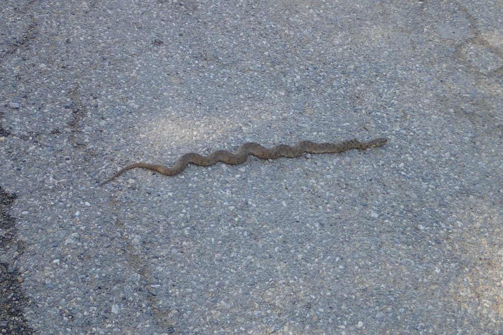 道の真ん中にこんな状態でヘビが車に轢かれて死んでいた。その前に道を横切る兎を見かけ、兎は素早いからカメラにおさめられないと話していたら、